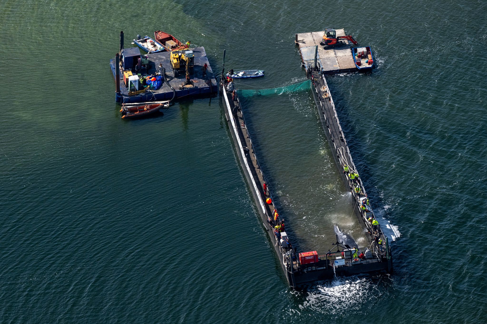 Nachdem der vor der Insel Poel gestrandete Buckelwal im Lastkahn für den Transport angekommen ist, hat sich Mecklenburg-Vorpommerns Umweltminister Till Backhaus erleichtert gezeigt. «Mir fällt wirklich ein Stein vom Herzen», sagte der SPD-Politiker. Die Idee mit der Barge sei hervorragend gewesen. «Er fühlt sich in der Barge wirklich pudelwohl», sagte er.