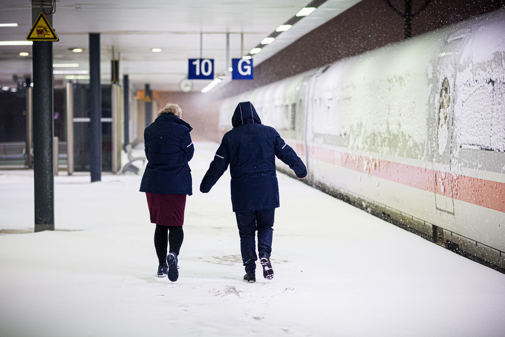 Zwei Bahn-Mitarbeiterinnen laufen am frühen Morgen über den Hauptbahnhof Hannover. Moritz Frankenberg/dpa