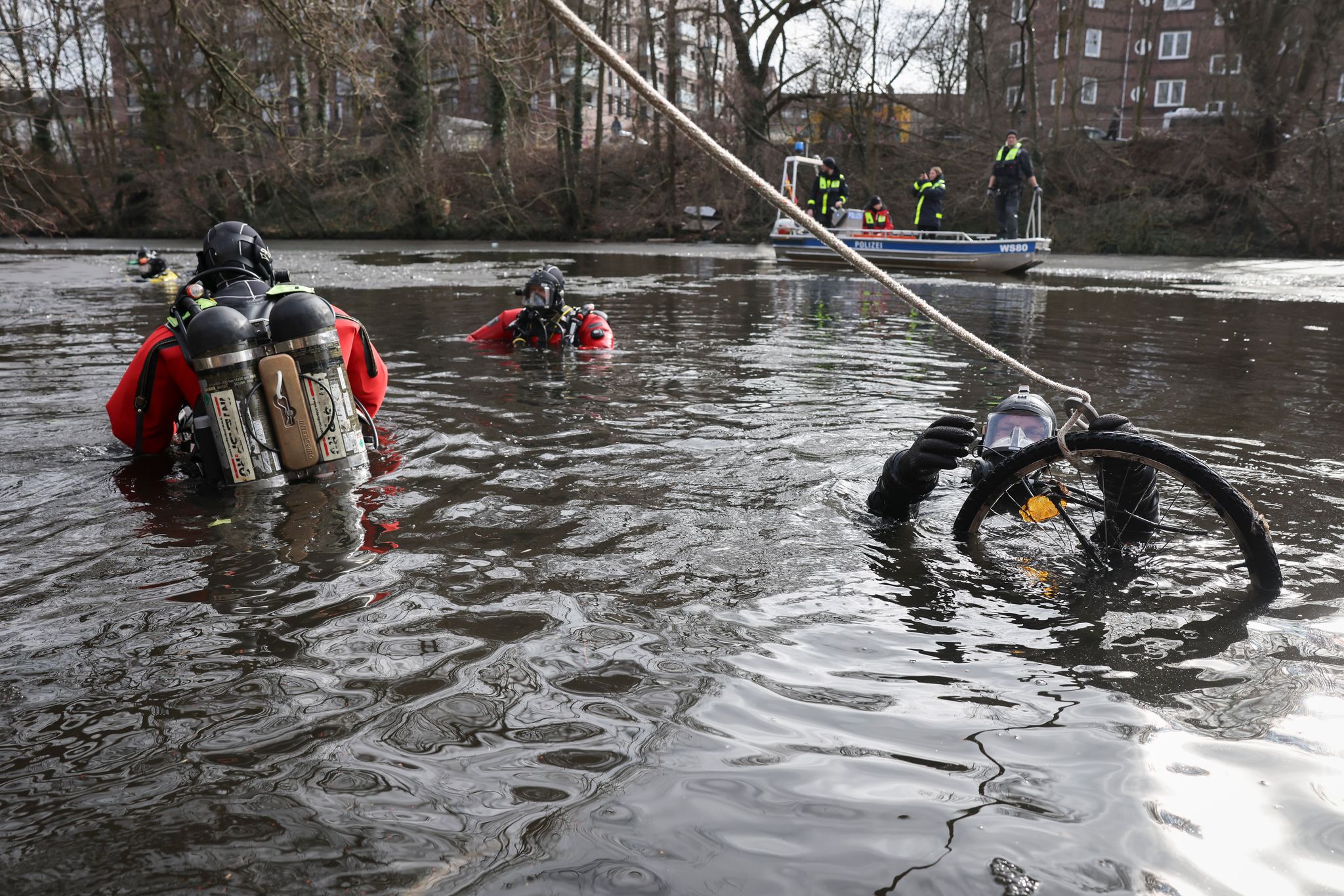 Mehrere Einkaufswagen, Fahrräder, E-Scooter und Laptops haben Taucher bei der Aktion «Hamburg räumt auf» aus einem Kanal geborgen. Über eine Stunde hinweg gingen die Taucher von Polizei, Feuerwehr und DLRG (Deutsche Lebens-Rettungs-Gesellschaft) bei einem Pressetermin ins zwei Grad kalte Wasser.