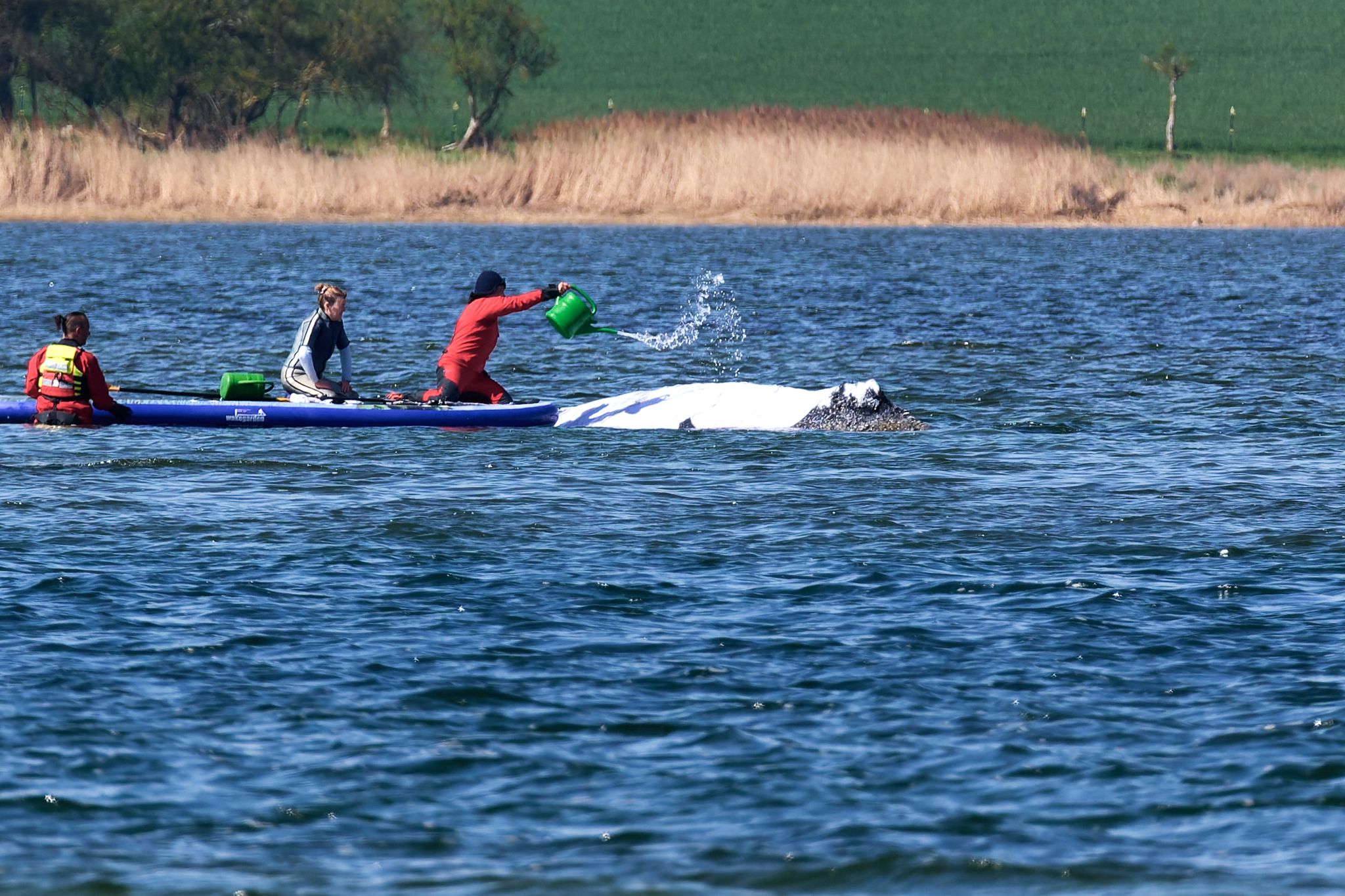 Der Buckelwal wird von Helfern vor der Insel Poel mit Wasser aus einer Gießkanne bespritzt. Marcus Golejewski/dpa