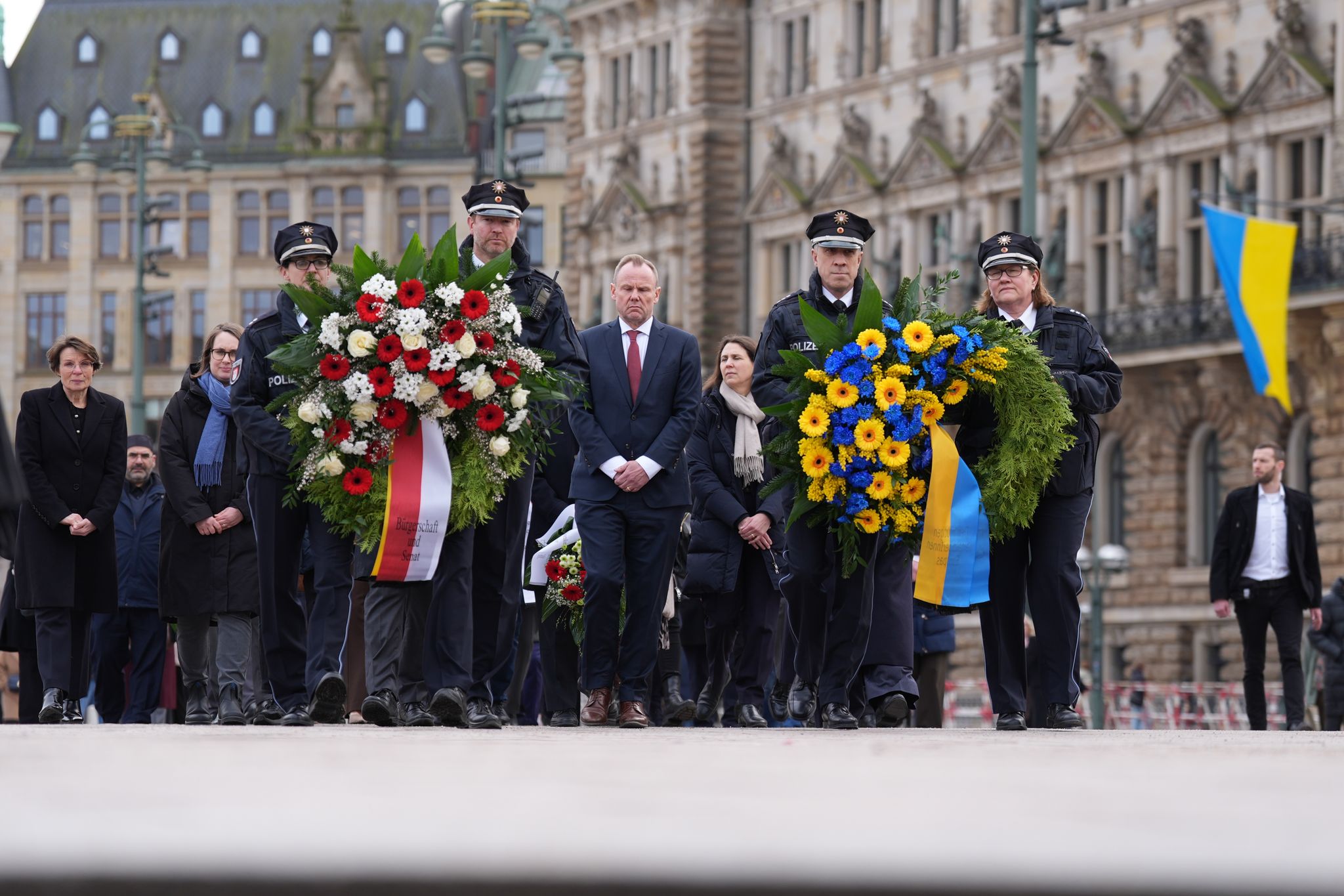 Zuvor hatten Grote, der Vizepräsident der Hamburgischen Bürgerschaft, Frank Schmitt, sowie die Generalkonsulin der Ukraine, Iryna Tybinka, der Verstorbenen, Verletzten und Vertriebenen gedacht und an der Ernst-Barlach-Stele unweit des Rathauses Kränze niedergelegt. «Heute vor vier Jahren, am frühen Morgen des 24. Februar 2022 hat Russland in einer großangelegten, lange geplanten militärischen Operation die gesamte Ukraine angegriffen», sagte Grote. Seitdem tobe ein verbrecherischer Angriffskrieg mitten in Europa.