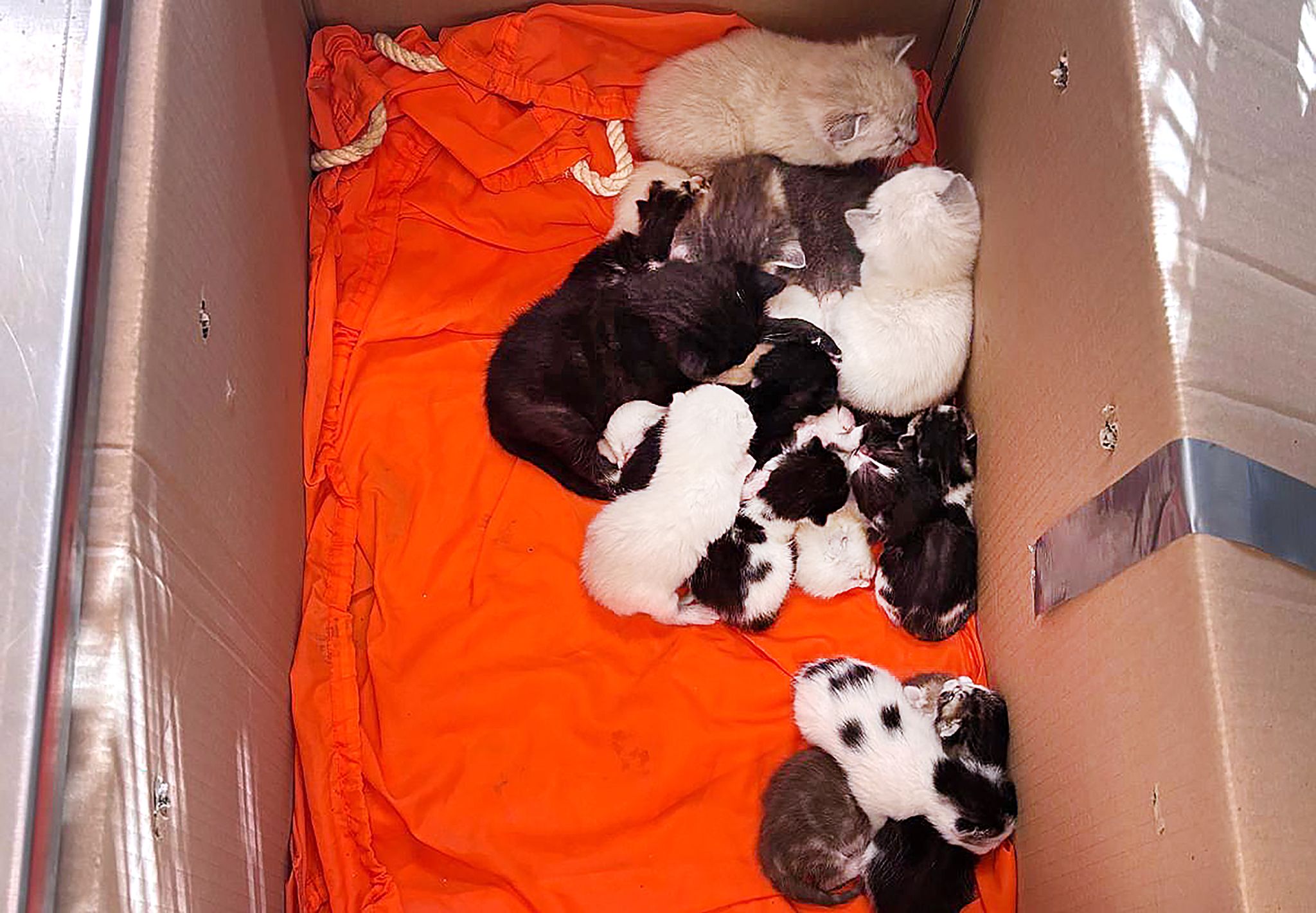 Nach dem Fund von 20 Katzenbabys und drei ausgewachsene Katzen in verschlossenen Kartons ermittelt die Bremer Polizei wegen Verstoßes gegen das Tierschutzgesetz. (Handout) —/Polizei Bremen/dpa