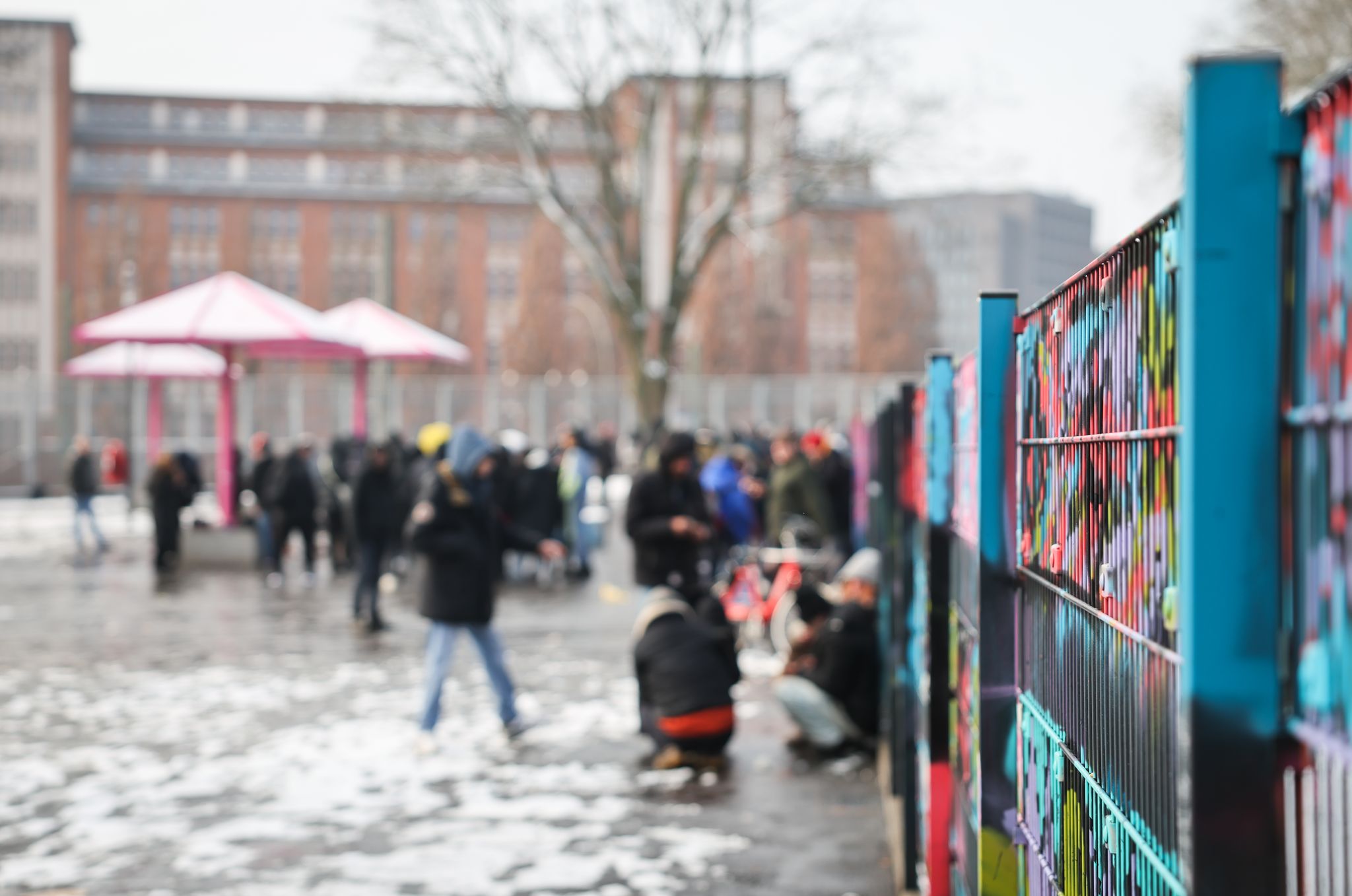 Vor dem Drob Inn in der Nähe des Hauptbahnhofs halten sich täglich mehrere Hundert Drogenabhängige auf. Im vergangenen Dezember waren es nach Angaben des Senats durchschnittlich 230 Personen. In der Einrichtung können Abhängige unter hygienischen Bedingungen legal Drogen wie Crack konsumieren. Der Bereich um die Einrichtung im Stadtteil St. Georg gilt als sozialer Brennpunkt.