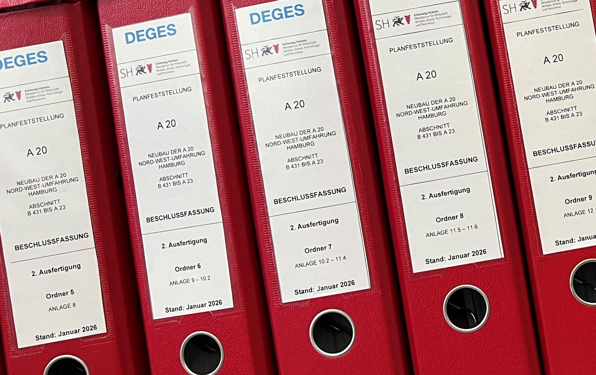 Für einen weiteren Abschnitt der Autobahn 20 in Schleswig-Holstein liegt nun ein Planfestellungsbeschluss vor. Die 30 Aktenordner für den 15,3 Kilometer langen Abschnitt zwischen Glückstadt an der Elbe und der Autobahn 23 umfassen rund 800 Seiten. Bis hier die Bagger rollen, werde es noch ein wenig dauern, sagte Schleswig-Holsteins Verkehrsminister Claus Ruhe Madsen (CDU). «Aber der heutige Beschluss stellt eine wichtige Weiche für die Durchbindung der A20 nach Niedersachsen und schafft die Voraussetzung dafür, dass die Elbtunnel-Verkehre in Zukunft auch rasch die A23 erreichen.»