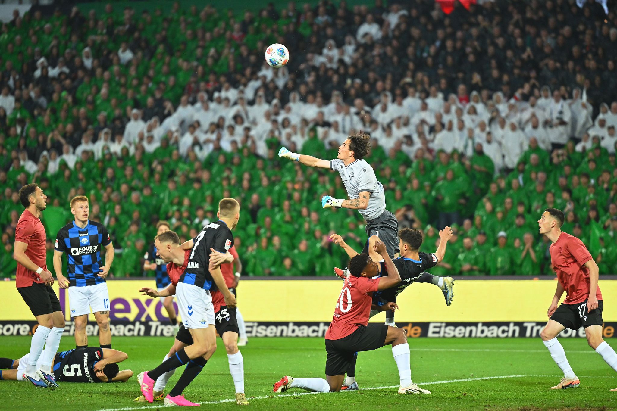 In den ersten 20 Minuten war einzig die eindrucksvolle Choreographie der Fans von Hannover 96 mit schwarz-weiß-grünen Fahnen zum 130. Vereinsgeburtstag bemerkenswert. Die erste gute Chance des Spiels entstand eher zufällig: Eine Flanke von 96-Stürmer Benjamin Källman wollte Paderborns Raphael Obermair klären. Sein Versuch landete am Kopf von Hannovers Waniss Taibi, von dort ging der Ball an den Pfosten.