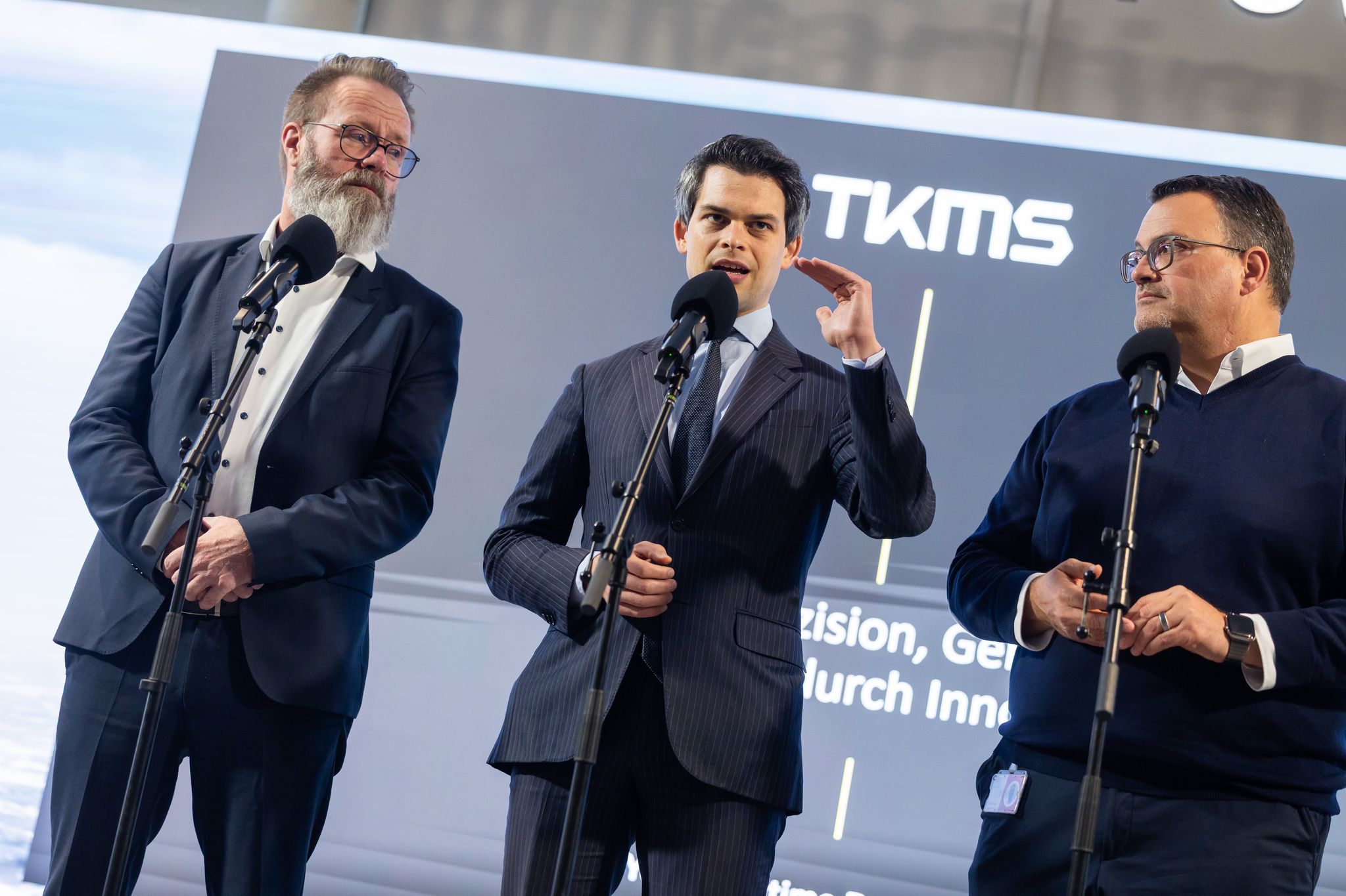 Der maritime Beauftragte der Bundesregierung, Christoph Ploß (Mitte) spricht in Kiel mit Wirtschaftsminister Claus Ruhe Madsen (links, CDU) und TKMS-Chef Oliver Burkhard. Ulrich Perrey/dpa