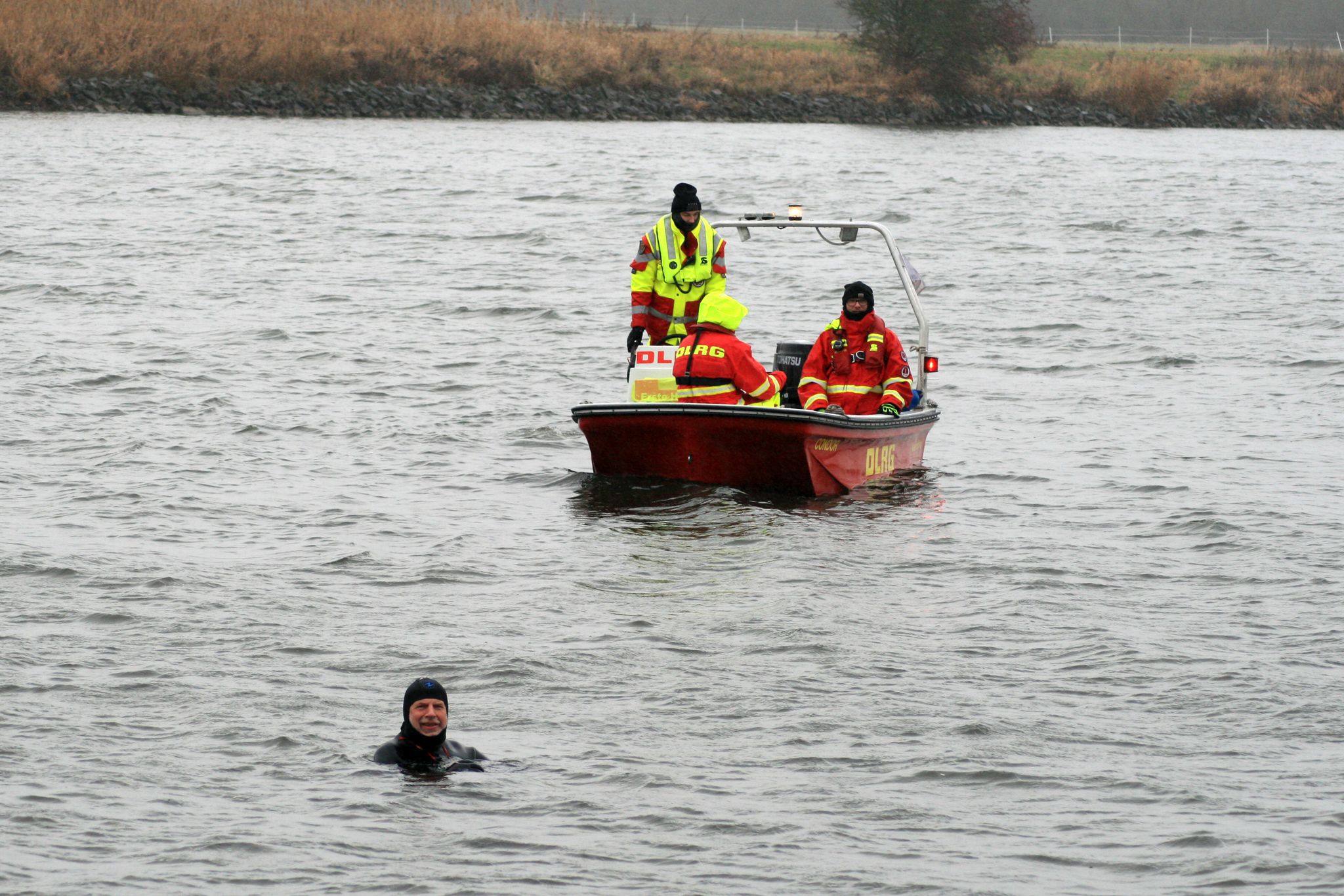 Mehrere Boote mit Einsatzkräften begleiteten die Schwimmerinnen und Schwimmer auf ihrer Strecke von der Feuerwehr bis zum Hafen im Ortsteil Dreye. Die Schwimmer waren unter anderem wegen einer ungünstigen Strömung teils mehr als zwei Stunden im Wasser. Einige brachen mittendrin ab und kletterten auf die Boote, wie der Reporter berichtete. Das eiskalte Abenteuer an Silvester hat mittlerweile Tradition: Ortsfeuerwehr und DLRG organisierten das Schwimmen zum 49. Mal.