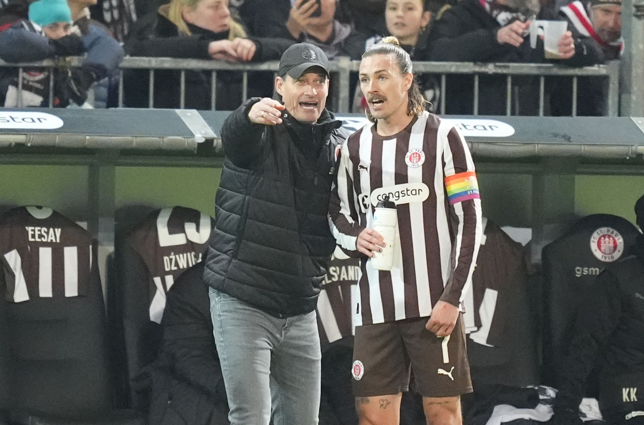 Der Cheftrainer und sein wichtigster Spieler: St. Paulis Alexander Blessin (l) kann wieder auf Kapitän Jackson Irvine zurückgreifen. Marcus Brandt/dpa