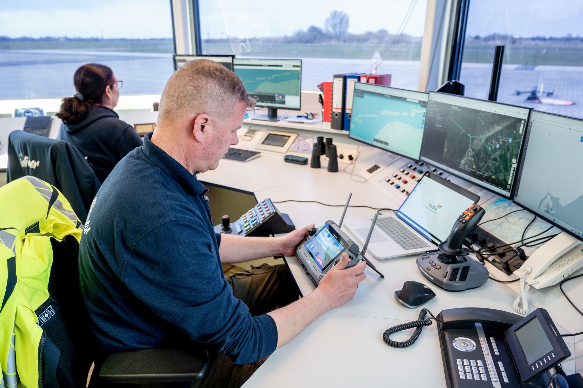 Konzentriert blickt Ingo Hellmann auf eine Konsole mit Monitor und zwei Joysticks vor ihm. Während um ihn herum im Kontrollraum des Flugplatzes im ostfriesischen Norddeich Flug- und Schiffsbewegungen über mehrere Monitore flimmern, macht Hellmann eine Drohne startbereit – vom Schreibtisch aus. «Haben wir irgendetwas in der Luft?», fragt Hellmann seine Kollegin, die neben ihm die Monitore beobachtet. «Negativ, ist alles weit weg», antwortet sie. Der Luftraum über der Nordsee ist frei für einen Testflug.