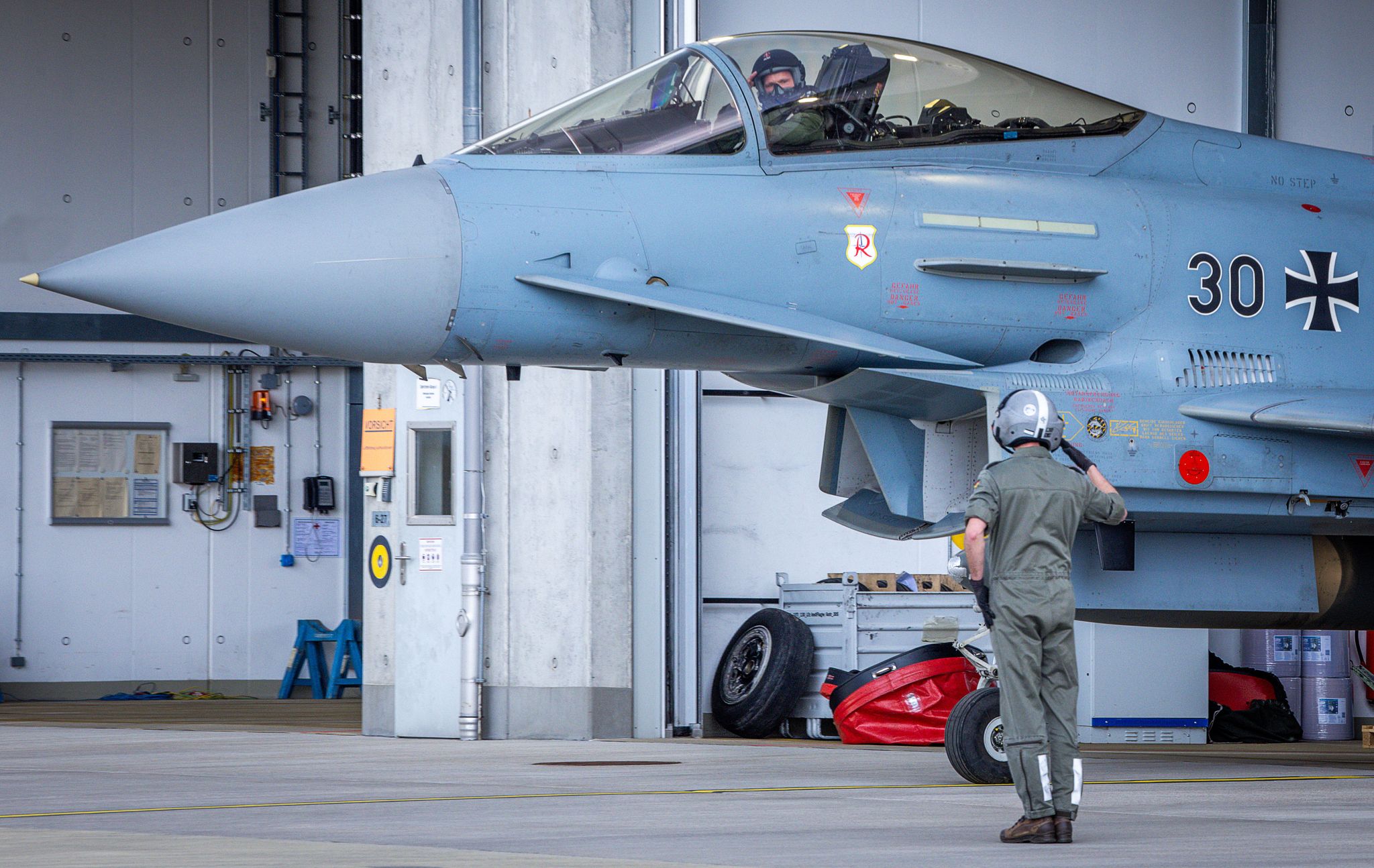 Zur Alarmrotte gehören insgesamt vier Eurofighter, die rund um die Uhr an 365 Tagen im Jahr jederzeit einsatzbereit sein müssen. Ausgerüstet sind die Maschinen unter anderem mit zwei Lenkflugkörpern und einer 28-Millimeter-Bordkanone.